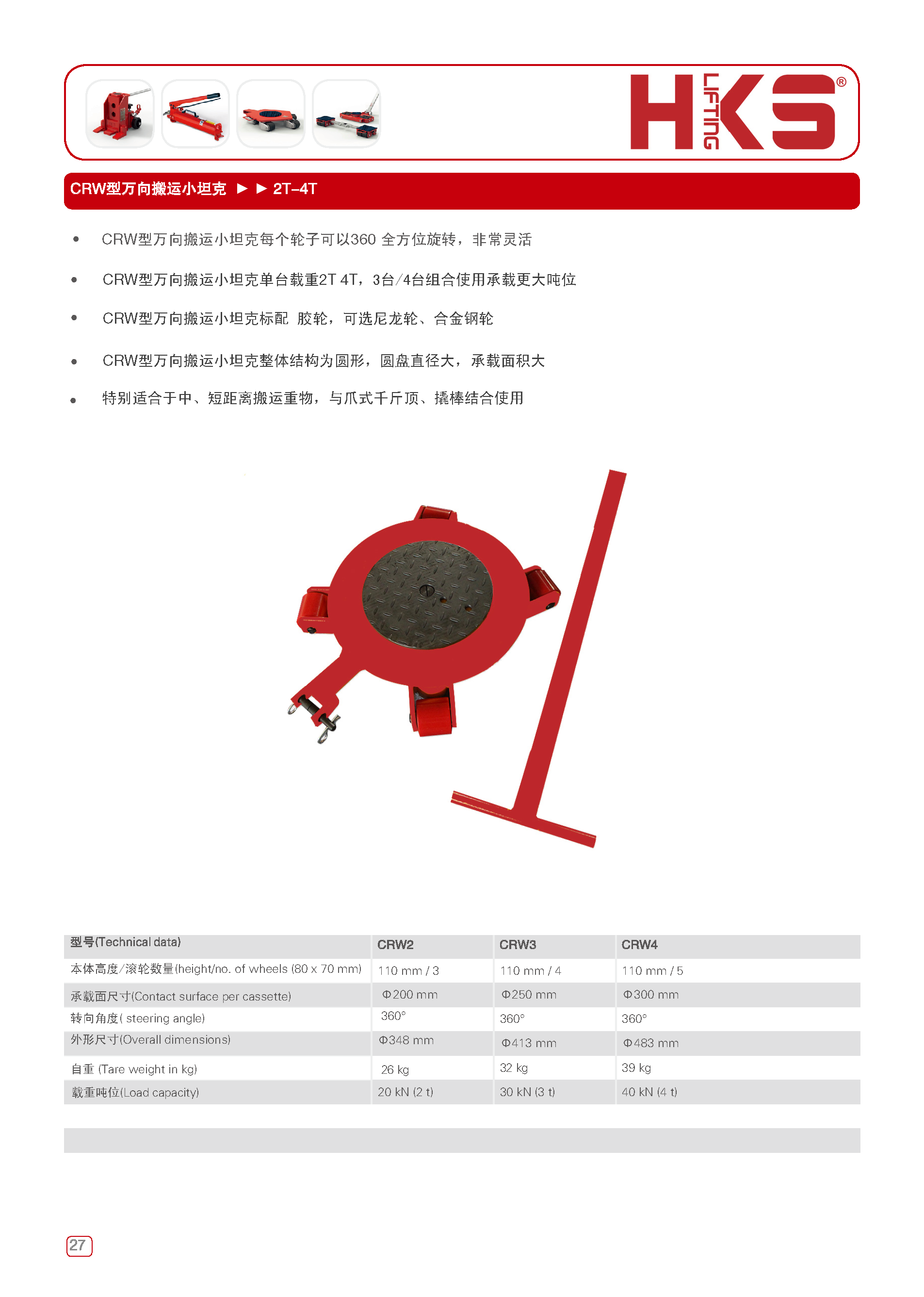HKS-LIFTING艾馳楷時搬運工具涵蓋了直行搬運坦克車、轉(zhuǎn)向搬運坦克車、萬向搬運坦克車、手搖搬運坦克車、履帶搬運坦克車,載重噸位從2噸達千噸。
