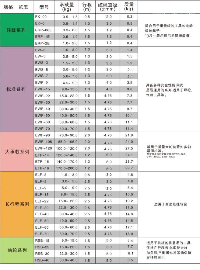 使用范圍:用于汽車模具、配件焊接、流水線及各種固定位置上工作量較集中,操作工具較笨重,使用工具持續(xù)時(shí)間較長的場合。無論在裝配生產(chǎn)線或固定工位工作的場合,也可作提升工具的輔助工具使用,達(dá)到減輕勞動(dòng)強(qiáng)度的目的。該產(chǎn)品借助卷簧積蓄的能量,使所懸掛的操作工具處于無重狀態(tài)。降低了操作工作的勞動(dòng)的強(qiáng)度,提高了勞動(dòng)生產(chǎn)效率。