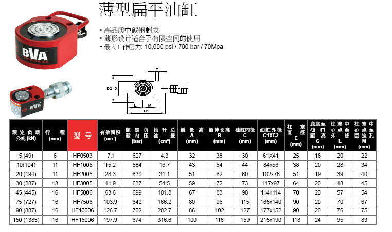 產(chǎn)品范圍:BVA液壓千斤頂類(lèi):H0500~H10010 BVA單作用分離式千斤頂,HG15006~HG100012 BVA大噸位單作用液壓千斤頂,HD1010~HD10018 BVA雙作用液壓千斤頂,HDG15006~HDG50006 BVA大噸位雙作用液壓千斤頂,HD20006~HD50006 BVA單作用大噸位千斤頂,HPD0906~HPD1610 BVA機(jī)臺(tái)生產(chǎn)用精密雙作用千斤頂,HL1001~HL10002 BVA薄型千斤頂,HF0503~HF15006 BVA超薄千斤頂,HU2002T~HU15006T BVA單作用鋁制千斤頂,HC1201T~HC10003T BVA單作用中空千斤頂,HDC3007~HDC10010 BVA雙作用中空千斤頂,HLN5502~HLN10012 BVA單作用固鎖式千斤頂,HT1006~HT1010 BVA帶螺紋千斤頂,HP0205~HP1006 BVA拉伸千斤頂