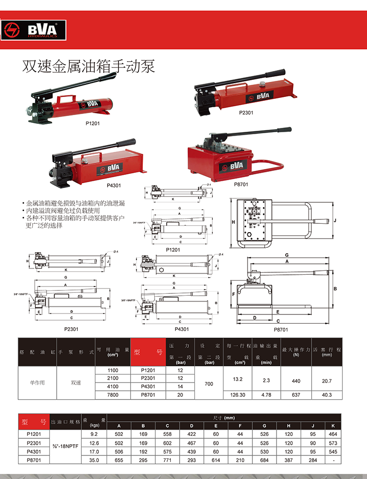 臺(tái)灣BVA雙速金屬油箱手動(dòng)泵 P1201 P2301 P4301 P8701