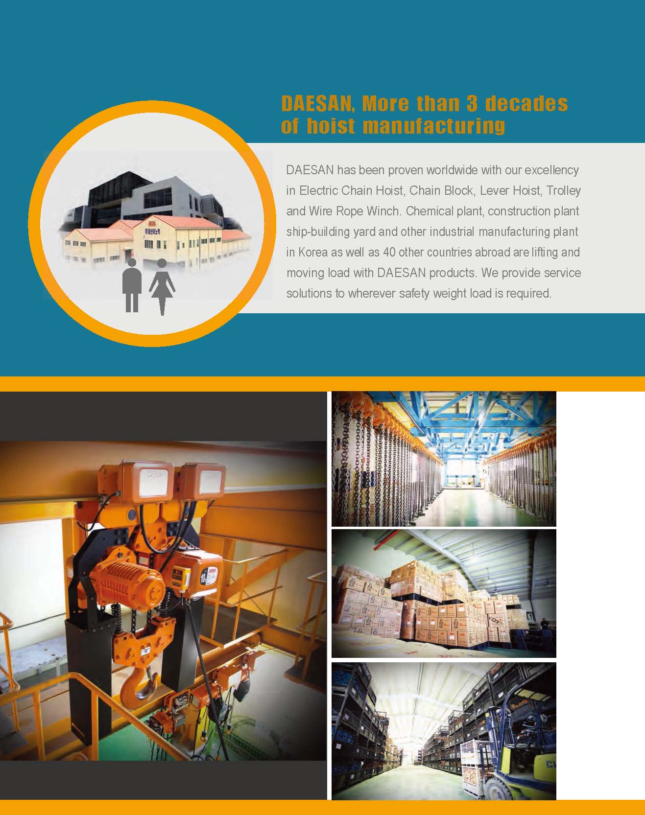 DAESAN大山INOTEC是一家專業(yè)生產(chǎn)物料起重搬運(yùn)產(chǎn)品 - 環(huán)鏈電動(dòng)葫蘆,手拉葫蘆,手扳葫蘆,手動(dòng)單軌小車,鋼絲繩絞盤等相關(guān)起重設(shè)備制造商,并為客戶做服務(wù)解決方案。...